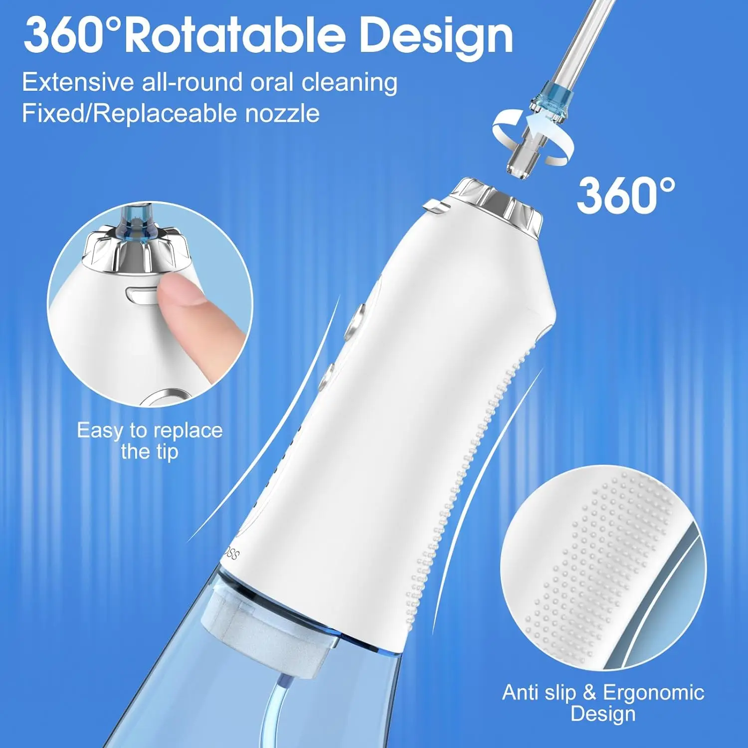 Update 5 Cleaning Modes--with 5 adjustable pressure levels,30-110PSI strong water pressure. Other products have only 3 modes, we offer 5 modes to choose form, Personalized care dental jet cleaner. The cordless dental water flosser can satisfied with all daily need, Highly recommended by dentists and orthodontists, suitable for all types of people. Unique Gravity Ball Design --portable water flosser solved the pain point of most oral irrigator must be held upright or specific angle, or it won't spray water.Inspiration comes from baby bottle,we adopts soft pipe with gravity ball design so the end of pipe will move to where you tilt in any angle when you use it. 5 Replacement Nozzles and IPX7 Waterproof--The package including a tongue cleaner, toothbrush, 4 different standard nozzles, and each standard nozzle has different functions, two for normal interdental cleaning, one for gingival cleaning, one for orthodontic cleaning. Everyone can choose the right mouthpiece for their teeth.and the power water flosser is IPX7 waterproof for full water washable, even use it in the shower. Leak-proof and Easy to Clean Water Tank -- with 300ml water reservoir provides enough and uninterrupted oral dental flossing.Just press the button, the water tank can be disassembled. it's much easier to clean the limescale inside of the water irrigator tank.Internal Leakproof Drainage Design has exclusive patent, which provides you safe and comfortable flossing experience. Tips: After the tips enter your mouth, at a 90 degree angle with your teeth, then open the gentle mode; Close your lips slightly to avoid splashing, but allow water to flow freely in your mouth; Please use it from the molar area, along the gum line, a short pause between the teeth until the inside and outside of the upper and lower teeth are cleaned. Please;